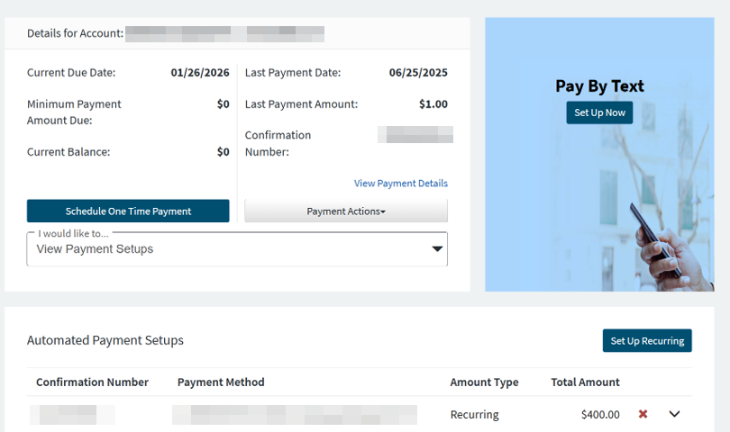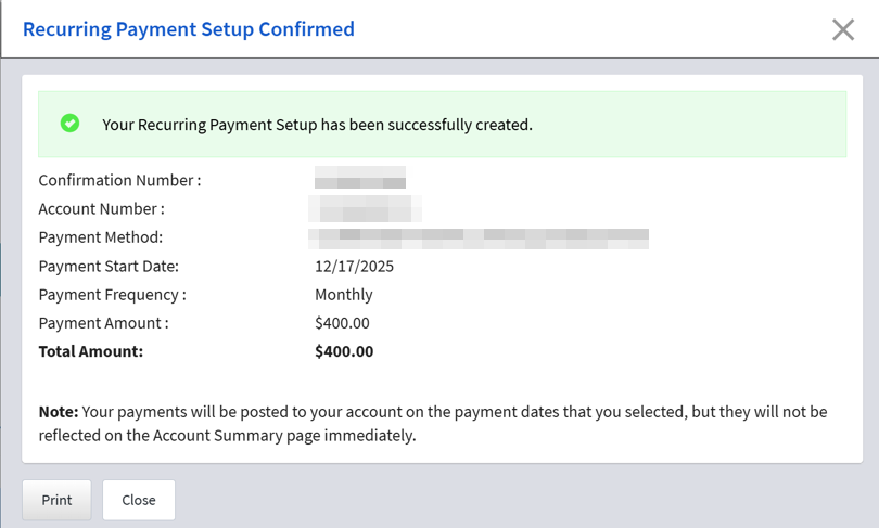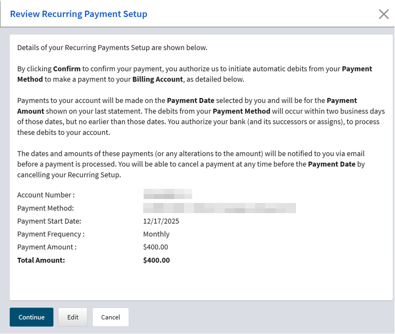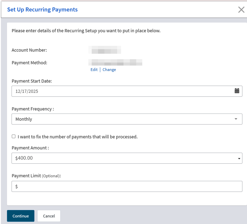 Ingrese la fecha de inicio del pago, la frecuencia de pago y el monto del pago, luego haga clic en Continuar.